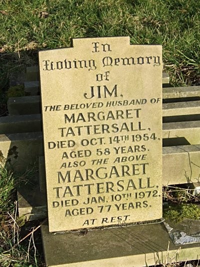 In Loving Memory of Jim The beloved husband of Margaret TATTERSALL Died Oct 14th 1954 Aged 58 years Also the above Margaret TATTERSALL Died Jan 10th 1972 Aged 77 years At Rest