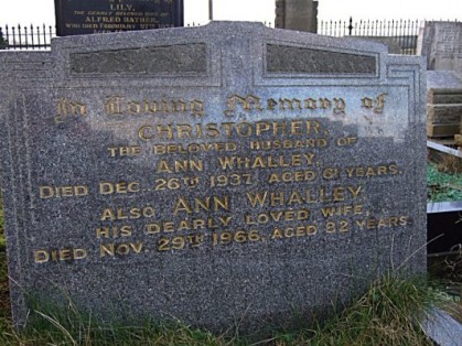 In Loving Memory of Christopher The beloved husband of Ann WHALLEY Died Dec 26th 1937 aged 61 years Also Ann WHALLEY His dearly loved wife Died Nov 29th 1966 aged 82 years