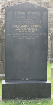 In Loving Memory of James BROWN of Burnley Who died January 30th 1932 Aged 75 years Also of Sarah BROWN Sister of the above Died May 13th 1936 Aged 77 years Also of Mary Elizabeth PICKLES Who died August 8th 1942 Aged 76 years At Rest