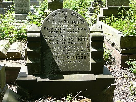 In Loving Memory of Ezra BOLTON of Barrowford Died June 14th 1921 Aged 87 years Also of Emily his wife Died June 2nd 1929 Also of Arthur The beloved son of Herbert & Mabel DIXON Died Kan 31st 1929 Aged 7 years