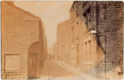 Cannon Street, Wapping, looking to the Market Hall, circa 1890. Wapping was the area bounded by Bridge street, St. James’ Street, Hall street and the River Brun. The building on the right was once a private house which was later converted to the “Black Dog” Inn. The area was prone to flooding, as shown by the two flood-lines below the gas lamp.