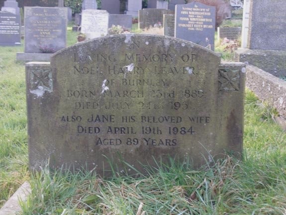 In Loving Memory of Noel Harry LEAVER of burnley Born March 23rd 1889 Died July 24th 1951 Also Jane his beloved wife Died April 19th 1984 Aged 89 years